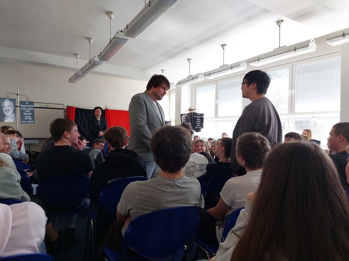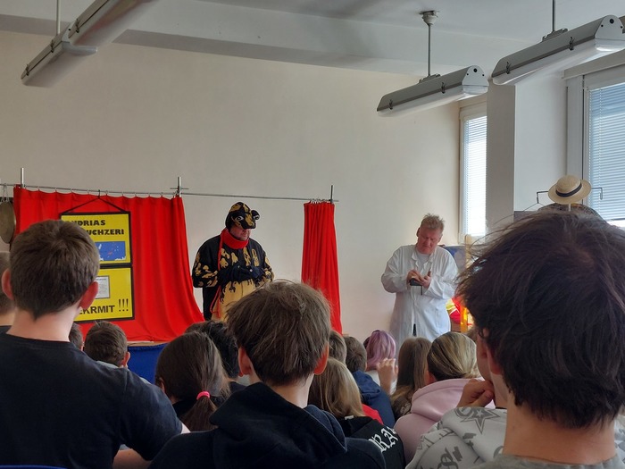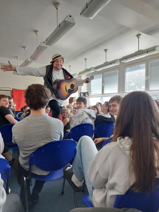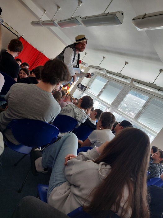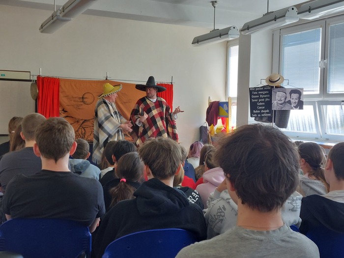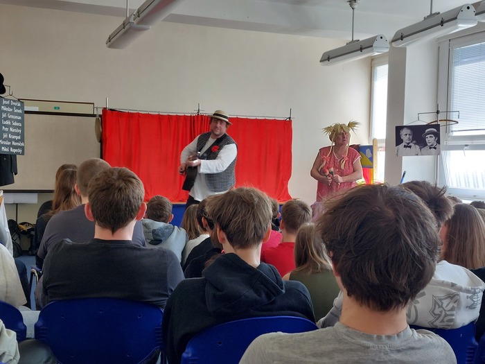 V pondělí 23. 3. 2026 tradičně navštívilo naši školu Divadélko Hradec Králové. Tentokrát žákům druhého stupně přiblížilo prostřednictvím hraných vtipných ukázek ve svém představení Divadelní učebnice významná česká divadla a jejich výrazné osobnosti a dramatiky.