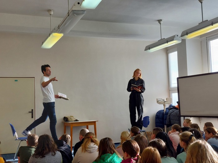 V úterý 23.1. proběhlo na naší škole Listování. Herci Lukáš Hejlík a Petra Bučková přednášeli I. stupni z knihy Eliáš a babička z vajíčka, II. stupeň si vyslechl části z knihy Dračí polévka. Všem se představení moc líbilo a budeme doufat, že nás dvojice v příštích letech zase navštíví.